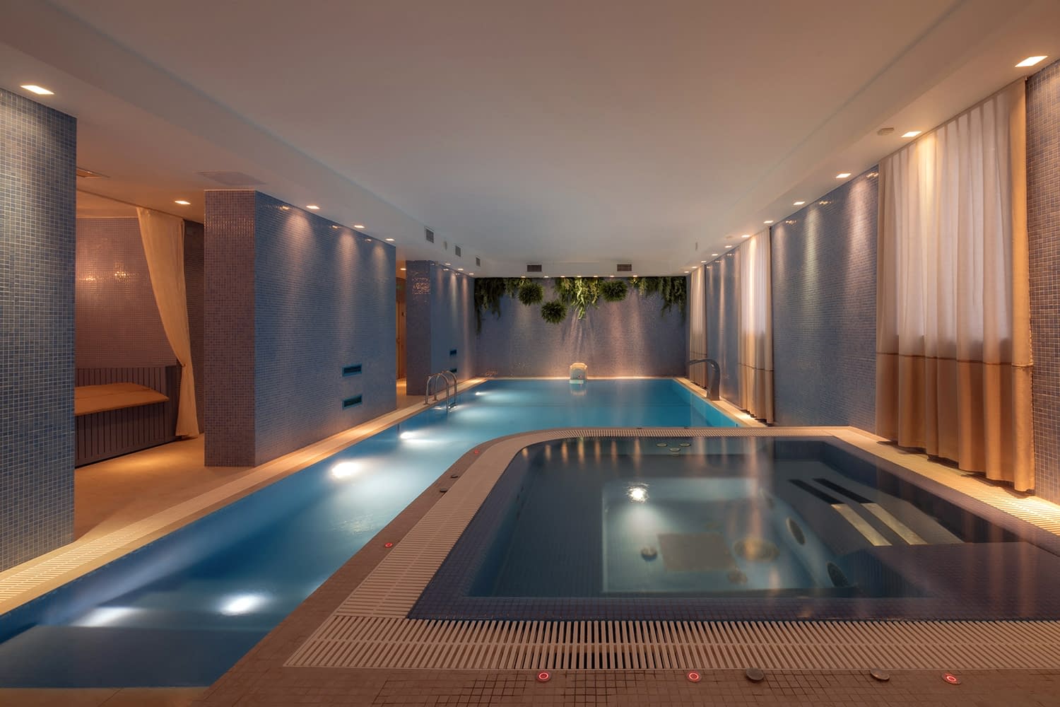 Каскадный бассейн, оснащенный ливневым водопадом, противотоком и гидромассажными форсунками. Даже периодические посещения помогут вам поддерживать мышцы в тонусе. В бассейне имеется спа-чаша, оборудованная донным гейзером и Pin-Up лежаком. Особый температурный режим в чаше позволит максимально расслабиться.